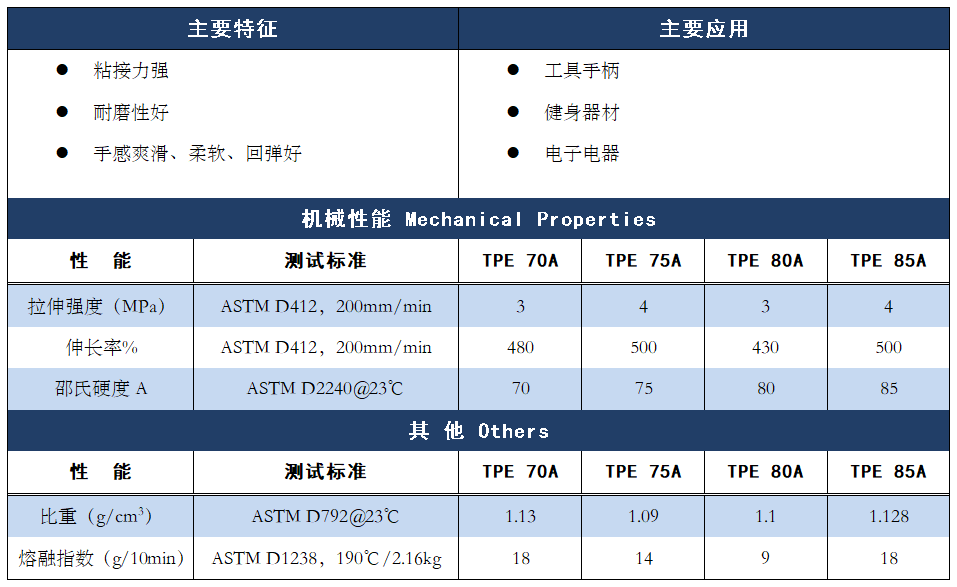 SEBS基TPE化合物由乙烯-丁烯形成软相,SEBS是最常用的苯乙烯嵌段共聚物,由SBS加氢制备。由于其 结构中缺乏双键,因此具有很好的耐热性、紫外线、耐油性和耐化学性TPE与PA塑料包覆成型,主要应 用于电子电器产品配件,电子数码产品配件,五金工具产品,运动健身器材配件 等等。 TPE包胶PA优势: